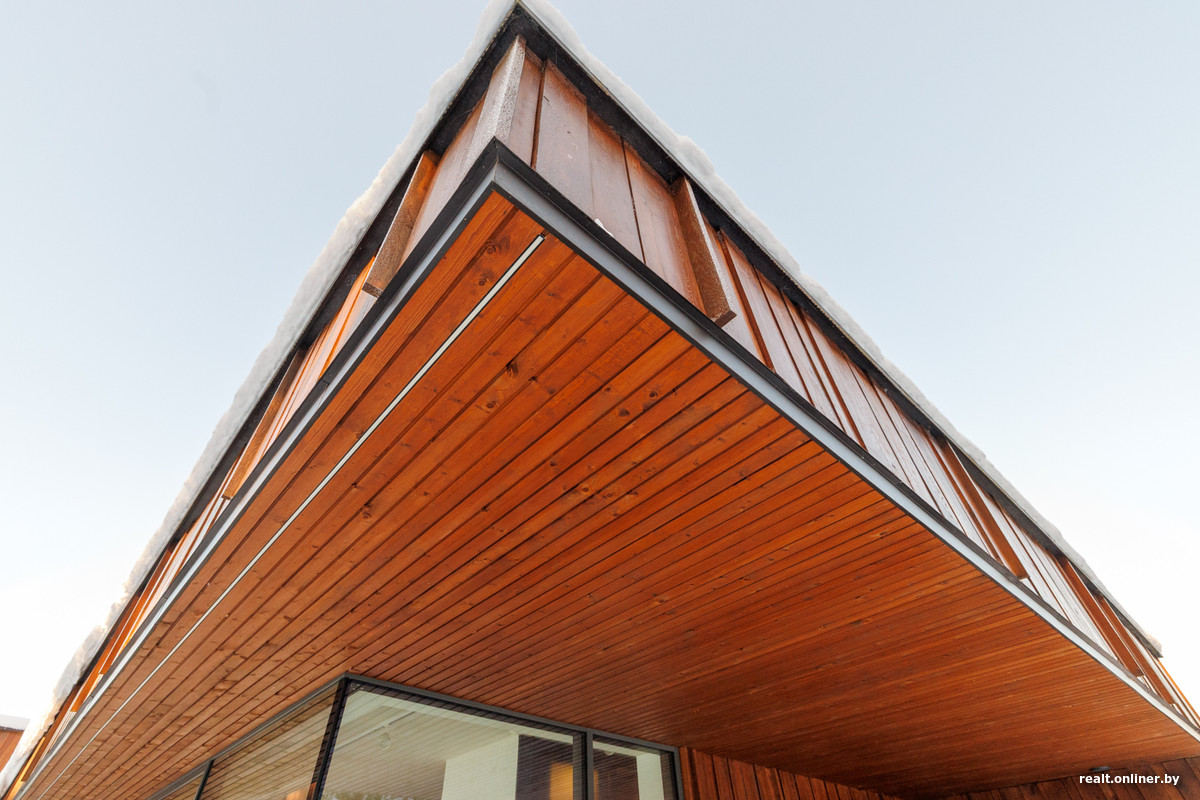 Дом опоясан панорамными окнами. Архитектор продумал, чтобы такому решению никак не помешал противоречивый климат страны. За счет навесов окна зимой не заметает снег, а летом не перегревает солнце. Сами окна энергоэффективные и закаленные.