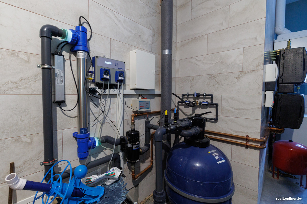 — В котельной разместили все необходимое для функционирования бассейна: станцию очистки, УФ-лампу, функцию подогрева. Это довольно дорогостоящая шведская система. Здесь же стоит оборудование, которое греет дом.