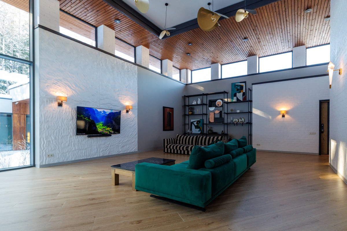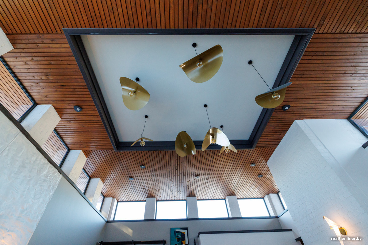 Значительную часть дома занимает гостиная, совмещенная с кухней. Их общая площадь — 137 «квадратов». По словам владельца, именно в этой части дома его семья собиралась проводить больше всего времени, поэтому было решено уделить ей повышенное внимание. С остальными помещениями гостиную разнит и высота потолков — тут она более 5 метров.