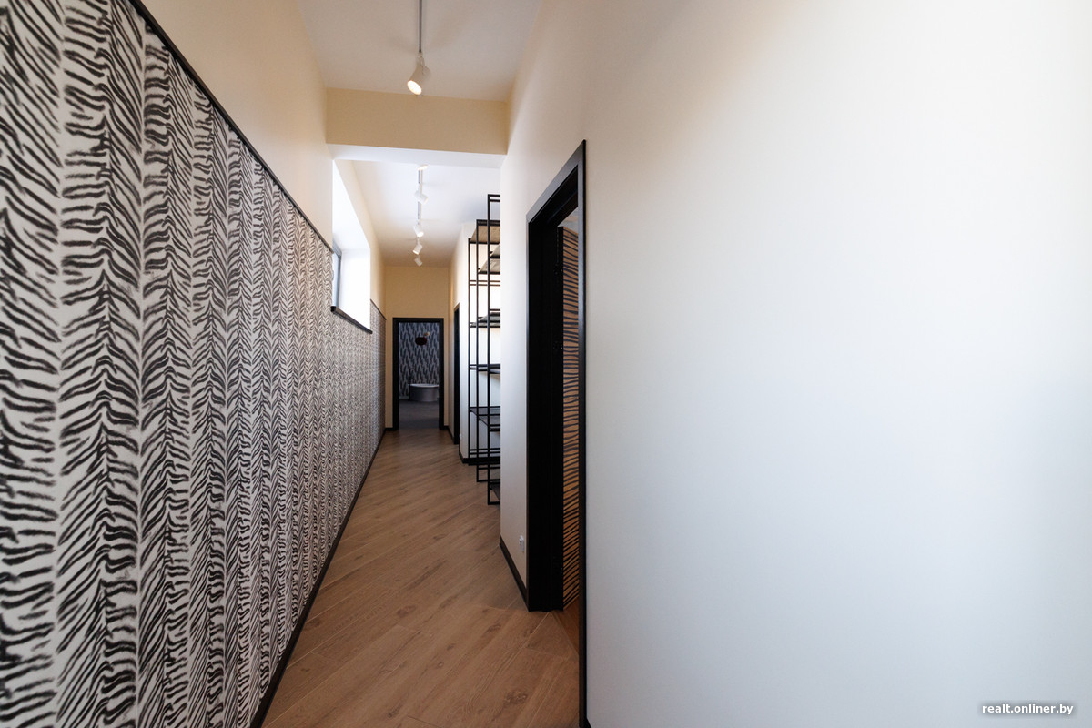 Привлекают внимание и эксцентричные межкомнатные двери с анималистическим принтом. В современных квартирах их обычно стараются спрятать, сделать незаметными, а тут они стали полноценными участниками интерьера. Двери сделаны из массива дуба, так что со звукоизоляцией у них все хорошо.