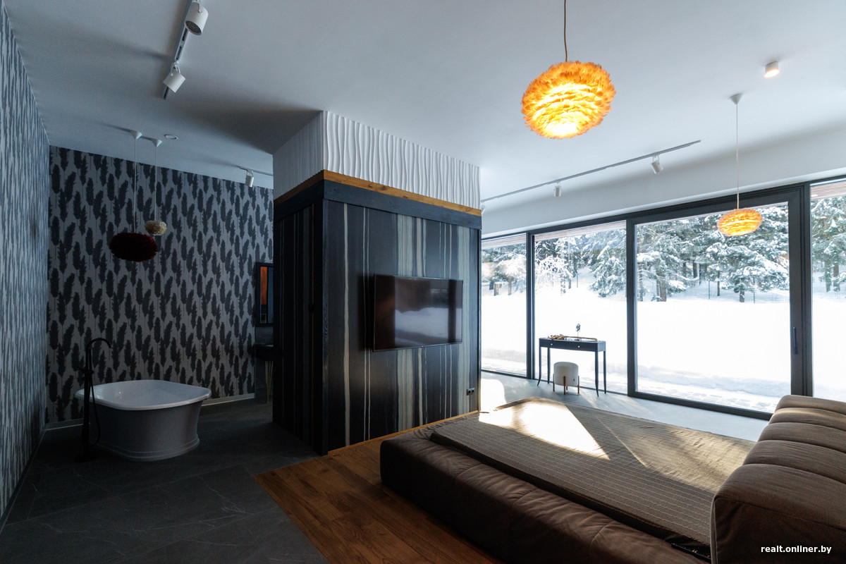 Заходим в мастер-спальню площадью 67 «квадратов» и сразу понимаем — она не для скромных. Да, огромная кровать, лежа на которой можно смотреть либо телик, либо зимнюю панораму, выглядит стандартно, но рядом с ней реализовано кое-что необычное.