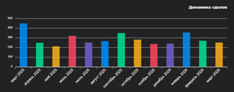 На сегодняшний день в базе БТИ за март числится 251 сделка. Однако их количество ещё увеличится, так как договоры продолжают регистрироваться и добавляться в базу. По предварительным прогнозам, по итогам месяца число сделок составит около 260.