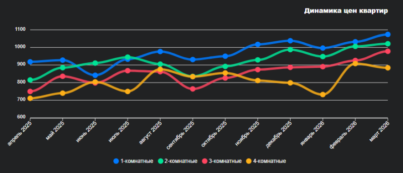 По итогу марта мы увидели следующие цены за метр на различные виды квартир: