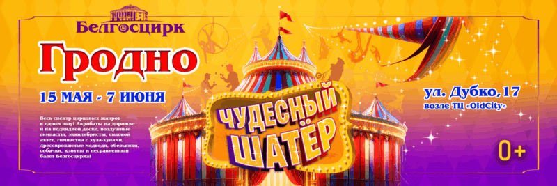 С 15 мая по 7 июня внутренняя парковка торгового центра превратится в цирковое пространство. Белорусский государственный цирк привезет в Гродно программу «Чудесный шатёр».