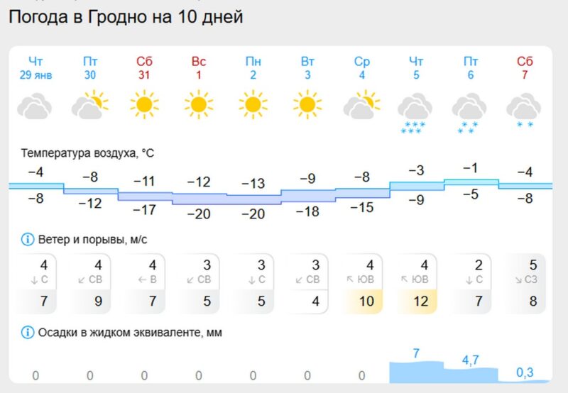 Согласно европейской модели прогноза погоды ECMWF, в ночь на субботу, 31 января, в северных регионах страны температура опустится до -25°С. В ночь на воскресенье, 1 февраля, похолодает до -21…-27°С по всей территории Беларуси, а местами – до -30°С.