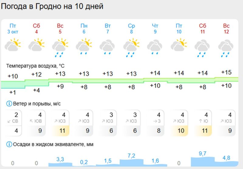 «Октябрь, стремительно набравший обороты и охладивший атмосферу над Беларусью до ноябрьских отметок, немного сбавит темпы, постепенно повышая градус и количество небесной влаги. В ближайшие сутки (3 октября) погодные условия в Беларуси продолжит определять область повышенного атмосферного давления, сформированная в холодной и влажной воздушной массе. Поэтому существенных осадков в стране не прогнозируется, лишь ночью местами по северо-востоку пройдут небольшие дожди. В ночные часы при малооблачной погоде во многих районах страны ожидаются заморозки от нуля до минус 2. На остальной территории минимальные значения температуры воздуха ночью составят 1-5 градусов тепла. Днем будет 7-13 градусов выше нуля. 4 октября (суббота) в неустойчивом воздухе местами будут отмечаться небольшие дожди.