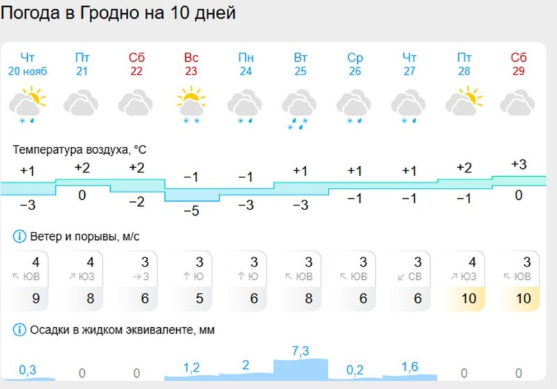 Территория нашей страны в основном будет находиться в циклонической циркуляции, установится пасмурная с осадками погода. Под влиянием атмосферных фронтов в большинстве районов страны пройдут осадки различной фазы (снег, мокрый снег, дождь) и интенсивности. При этом утром и днем 23 ноября (воскресенье) местами по Гомельской области осадки будут сильными. В утренние и дневные часы 23 ноября и ночью 24 ноября в отдельных районах страны не исключено налипание мокрого снега. 21-22 ноября (пятница-суббота) ночные минимумы будут колебаться от минус 4 до плюс 4 градусов, а дневные максимумы составят от минус 2 до плюс 6 градусов. 23-25 ноября температурный фон понизится и в ночные часы окажется в пределах от минус 9 до плюс 1 градуса, а днем станет колебаться от минус 4 до плюс 5 градусов. 26 ноября при поступлении более теплого воздуха с юга Европы ожидается небольшое повышение температурного режима. При колебаниях температурного фона местами будут отмечаться туманы и гололедные явления.