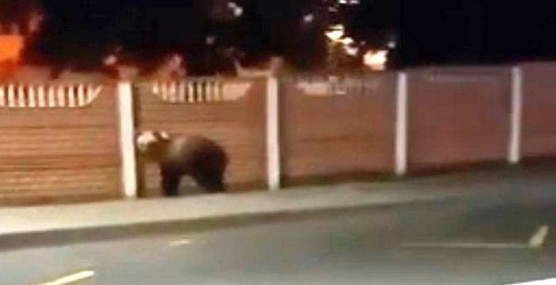 В сети появилось видео, в котором медведь бежит по дороге и тротуару в Колодищах Минского района.