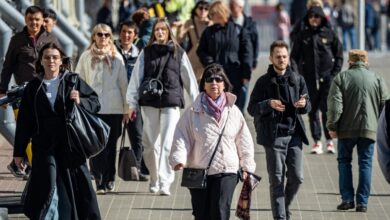 В объективе оператора и люди. Кто-то спешит по рабочим делам и сосредоточен, кто-то улыбается на прогулке с близкими, а вот малыши идут на первый звонок с цветами.