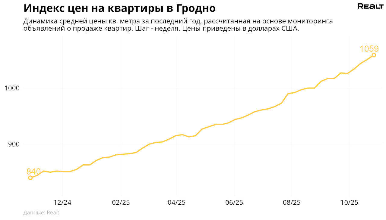 По данным сервиса Realt.by, с 20 по 27 октября общая стоимость квадратного метра в городе не упала, а, наоборот, выросла на 0.8% — до 1059 $. При этом предложение стало больше: количество объявлений о продаже увеличилось на 2.6%.