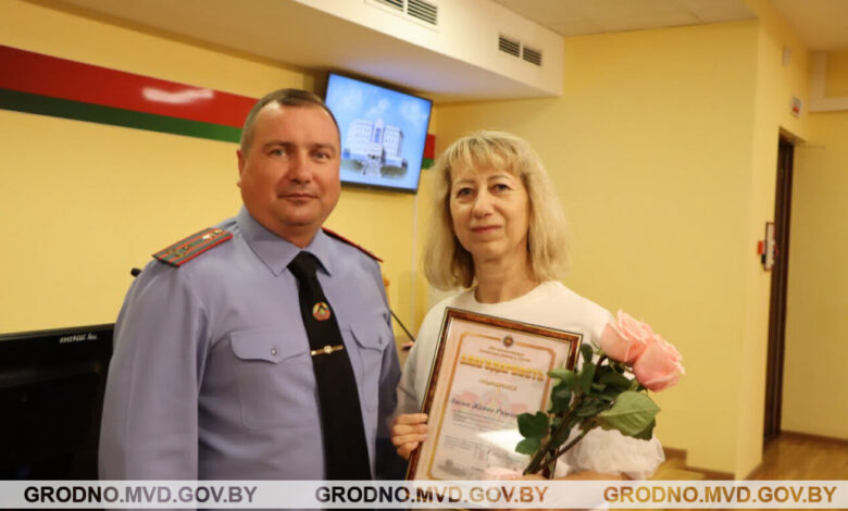 24 сентября в Ленинском РОВД Гродно состоялось торжественное чествование сотрудницы ОАО «Приорбанк» Жанны Лисюк. Начальник отдела Константин Смоляков лично поблагодарил её за проявленную внимательность и профессионализм, которые помогли предотвратить крупное мошенничество.