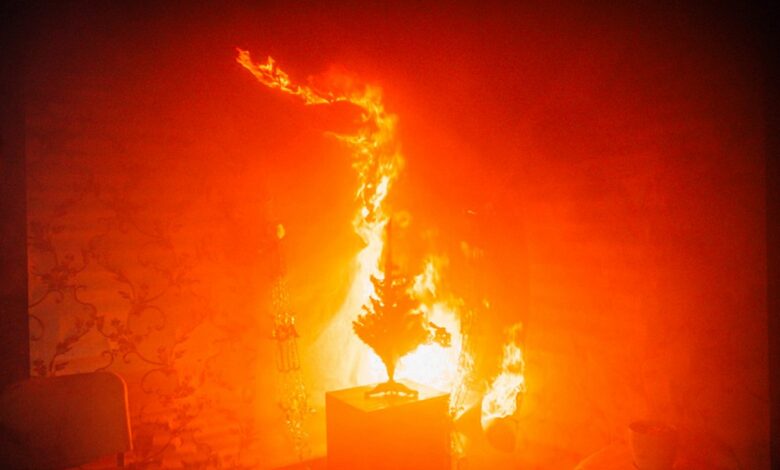 К ней поднесли бенгальский огонь. В итоге это за несколько секунд привело к возгоранию веток, украшенных легковоспламеняющимся снегом и снежинками.
