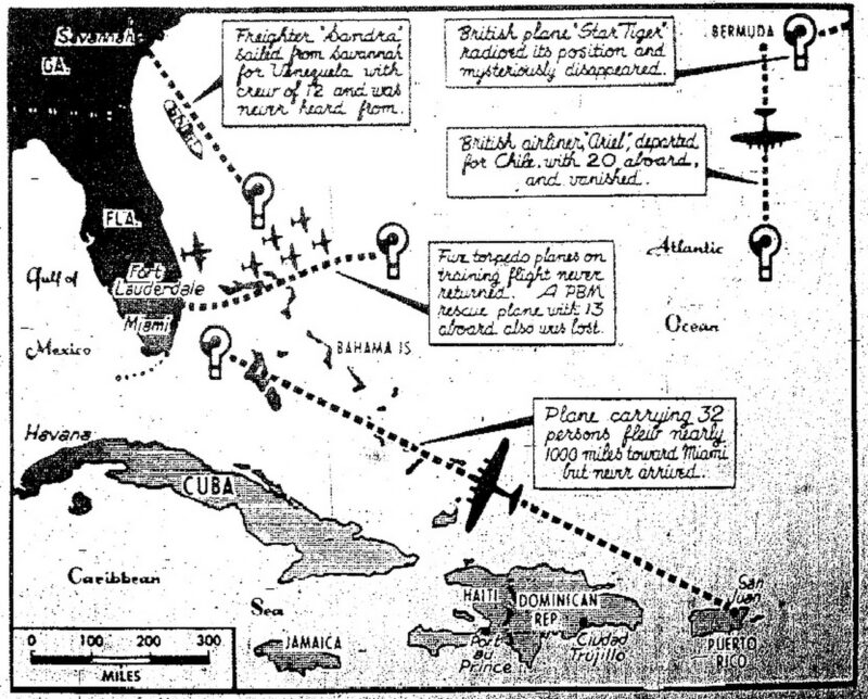 Странно, но про Бермудский треугольник заговорили только в 1950 году. Журналист Эдвард Джонс написал в Miami Herald заметку о необъяснимых катастрофах и даже нарисовал первую карту — от Флориды к Бермудам, потом к Пуэрто-Рико и обратно.