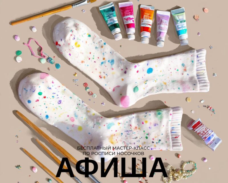 С помощью кисточек и красок будем вместе превращать обычные белые носки в произведение искусства. Модно, эксклюзивно и очень весело!