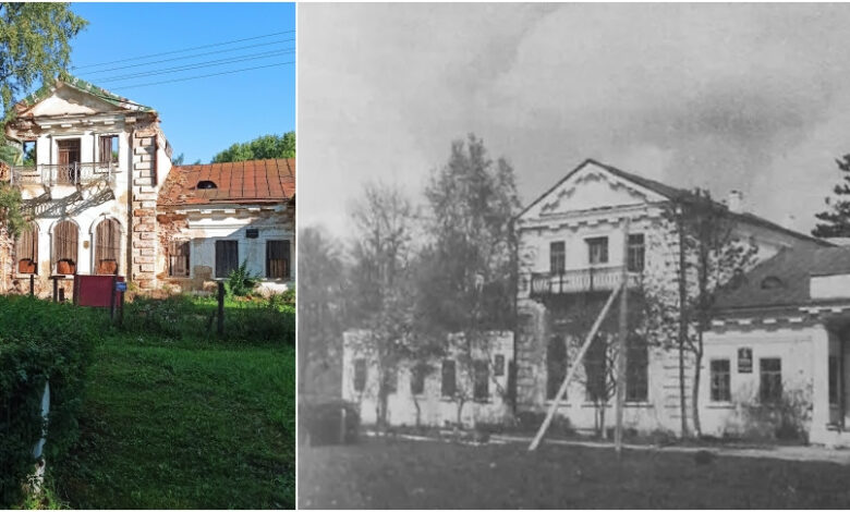 Сама усадьба одноэтажная, при этом ее центральная часть насчитывает два этажа. Выход находится в правой части дома, что обычно не свойственно проектам такого рода. Есть предположение, что объект перестроили. В некоторых источниках имеется информация о том, что был такой же симметричный вход слева. Здание построено в стиле позднего классицизма, время медленно, но верно стирает его черты. Например, четырехколонный портик постепенно разрушается, а одна из колонн готова рухнуть в любой момент.