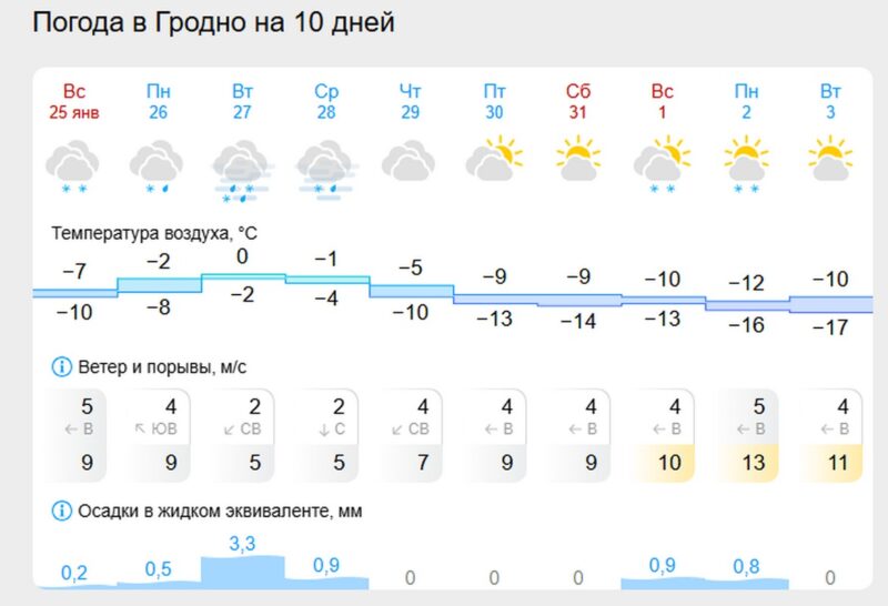 В Минске ночью прогнозируется −15…−17 °C. Днём температура составит −3…−5 °C. Ожидается снег с переходом в дождь, гололёд и гололедица на дорогах. Во второй половине дня тротуары станут особенно скользкими, что повысит риск травматизма.