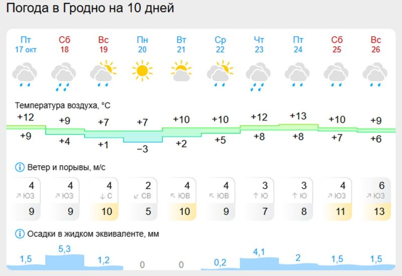 Уже 19 октября центр атмосферного вихря сместится на соседнюю Брянскую область России, но продолжит оказывать влияние на белорусскую погоду. Небо будет полностью затянуто облаками, а осадки, местами сильные в виде дождя и мокрого снега, пройдут в большинстве регионов.