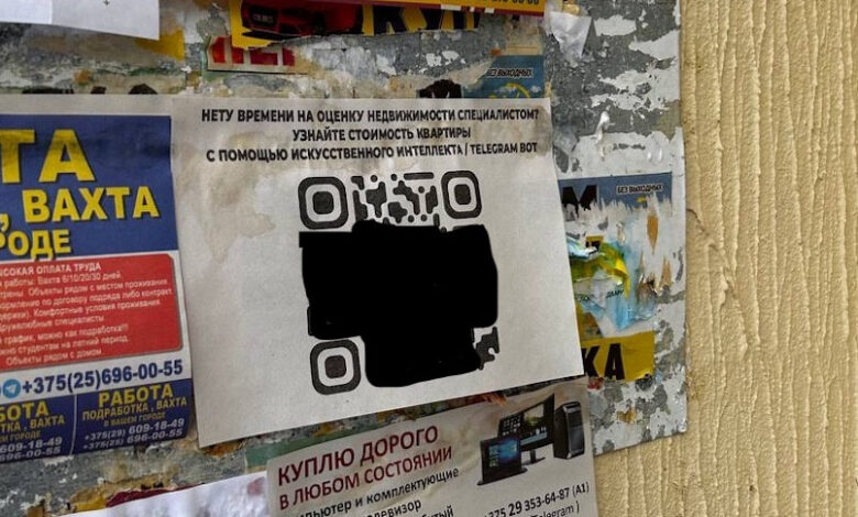 «Нету времени на оценку недвижимости специалистом? Узнайте стоимость квартиры с помощью искусственного интеллекта/telegram bot» — таков текст предложения на объявлениях, которые кто-то расклеивает у белорусских подъездов. Чтобы воспользоваться услугой, предлагают перейти по QR-коду в телеграм-бот.