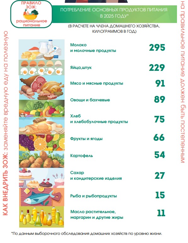 Если говорить о конкретных продуктах, то в лидерах по потреблению молоко и все, что из него делают, например, творог, сыры, кефир, йогурт и т.д. – всего 295 килограммов в год на человека. Мясо в среднем мы съедаем 91 кг в год. Плюс, 229 яиц на человека. А еще 75 килограммов хлеба, 54 кг картошки и 89 килограммов других овощей. Фруктов год средний житель области есть около 66 килограммов, а вот рыбы – всего 15 кг.