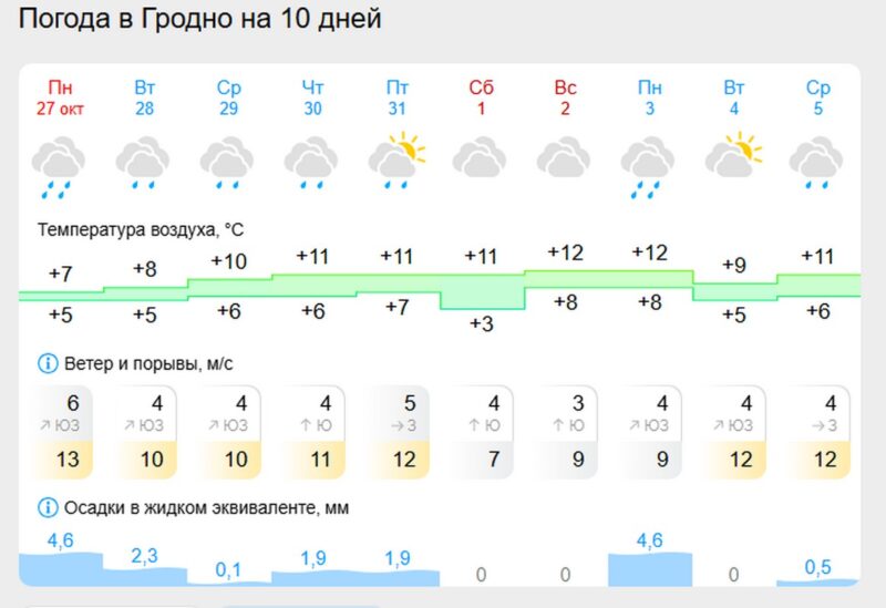 «Октябрь, оказавшись в плену циклонических вихрей, закончится на дождливой ноте, но ноябрь, заручившись антициклональной поддержкой, сменит этот тренд и уменьшит количество небесной влаги. А вот в температурном плане все стабильно: умеренно теплая осенняя погода. Поэтому до конца октября в Беларуси ожидается неустойчивая с осадками погода. Под влиянием атмосферных фронтов, смещающихся с Западной Европы, в большинстве районов страны пройдут дожди от небольших до умеренных. При этом 30-31 октября (четверг-пятница) местами дискомфорта будет добавлять сильный порывистый ветер. Вместе с тем в результате поступления воздушных масс атлантического происхождения ночные минимумы будут колебаться от 0 до 8 градусов, а дневные максимумы окажутся в пределах от 4 до 13 градусов, лишь 30 октября по югу воздух прогреется до плюс 15», — рассказали в Белгидромете.