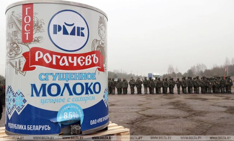 И в подарок военнослужащим — сладкий сюрприз. В декабре на Рогачевском МКК сошла с конвейера трехмиллиардная банка любимого всеми лакомства. В честь этого события было решено масштабировать привычный объем в несколько тысяч раз. Самую увесистую порцию сгущенки передали военнослужащим, выполняющим задачи по укреплению государственной границы. Банка, которую доставили сегодня военным, весит одну тонну. На Рогачевском МКК подчеркнули, что это не только рекорд Беларуси, но и мира. Дегустация сладкой продукции из гигантской емкости состоялась на месте.