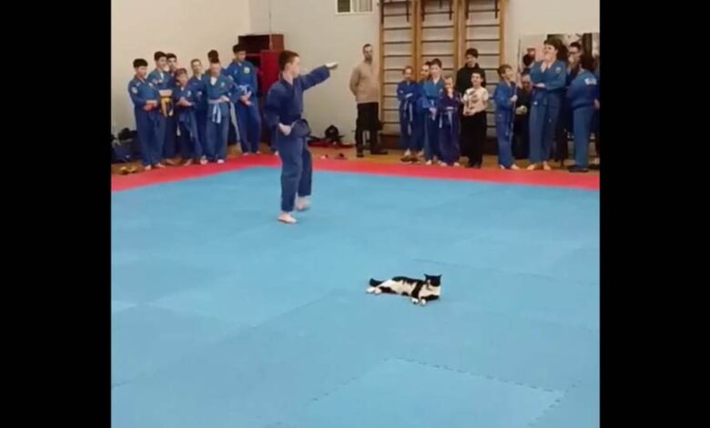 Во время соревнований по вьетнамским боевым искусствам на татами пришел черно-белый кот. Пушистый гость расположился посреди зала и невозмутимо лежал, пока участники демонстрировали мастерство.
