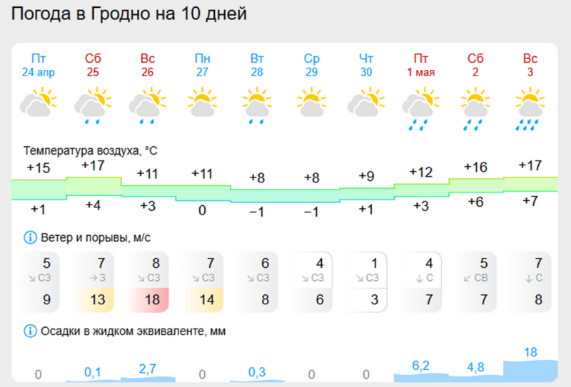 Температура в ночные часы составит 1–6°C тепла, но по Витебской области возможны заморозки до -3°C. Днем станет чуть теплее – от +10°C на севере до +18°C на юго-западе.