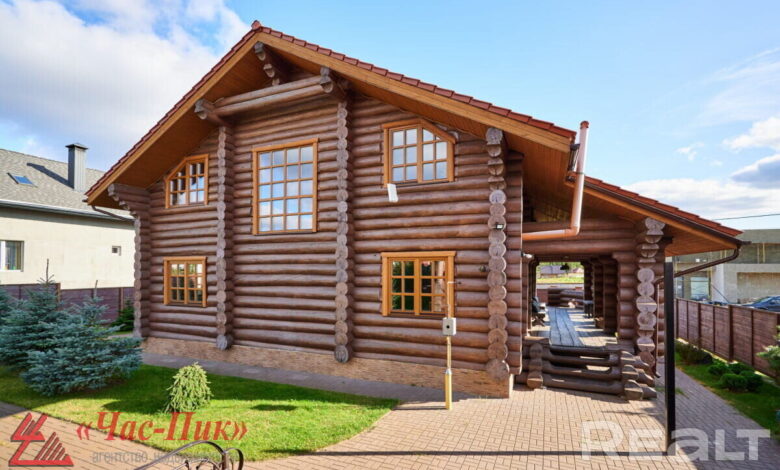Дом находится в СТ «Водолей-2010» в Минском районе и рядом с Вячей. Его построили в 2021 году в два этажа по индивидуальному проекту из бревна ручной рубки диаметром 40 см. На крыше — черепица. Общая площадь объекта — 425 м².