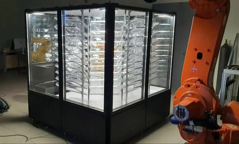 Аптека представляет собой закрытый куб, внутри которого расположены стеллажи с лекарственными средствами. Среди них передвигается робот, который достает нужный препарат и передает в окошко покупателю.