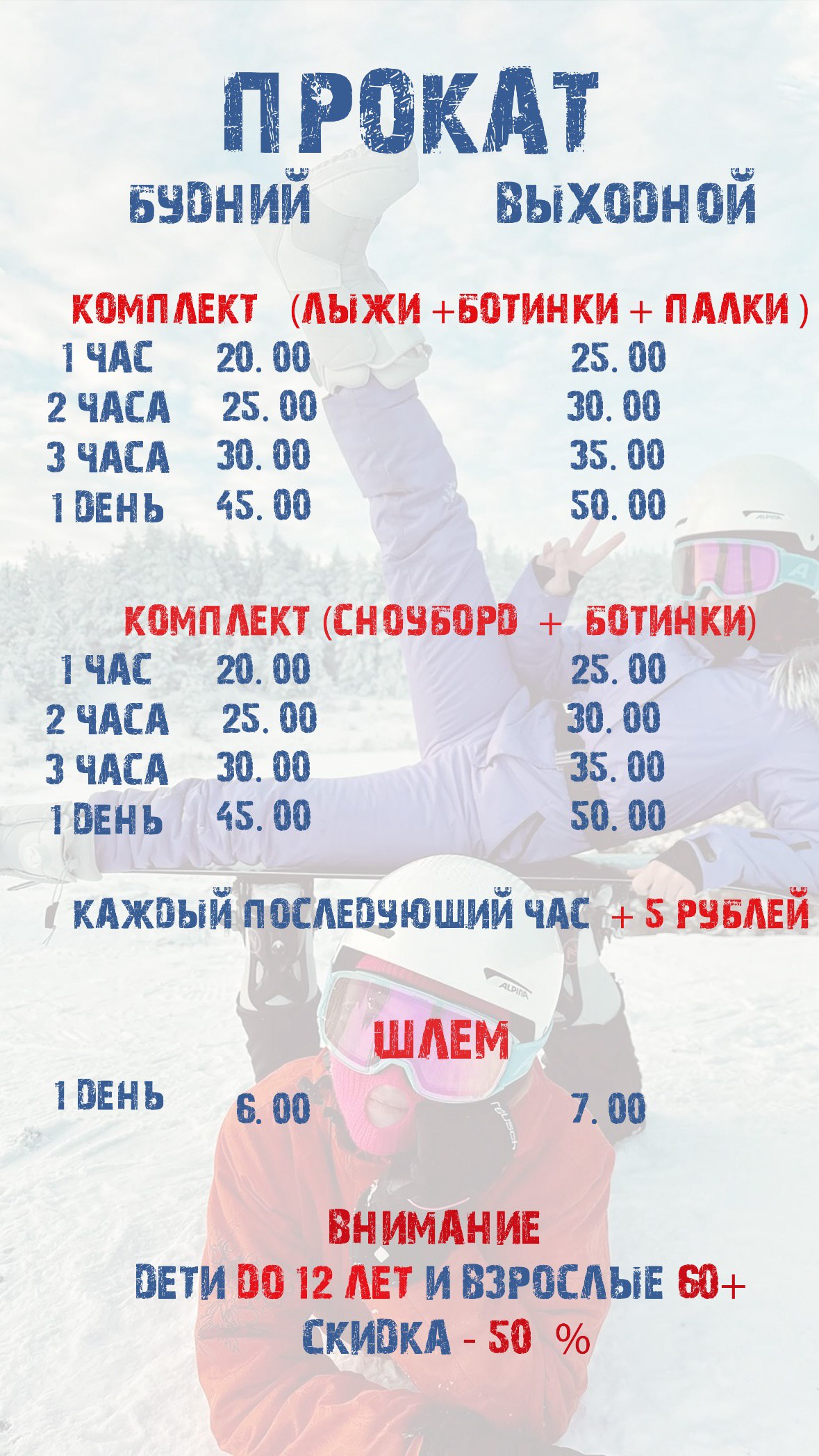 Комплекс лыжи-ботинки-палки обойдутся в 20-25 рублей в час в зависимости от дня недели. За шлем надо будет выложить еще 6-7 рублей.