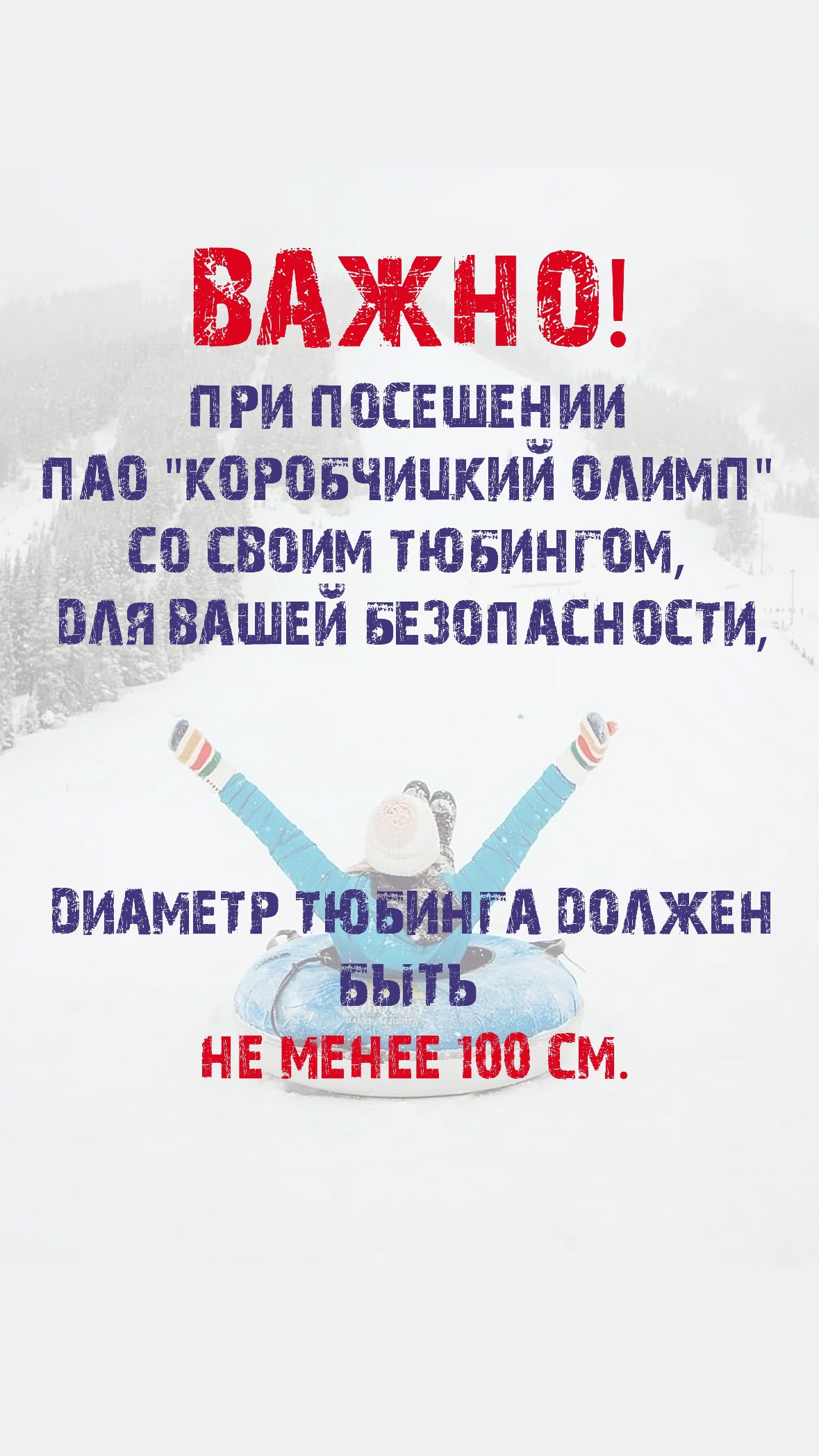 При катании всех просят соблюдать меры безопасности. Кстати, малышам до 7 лет вход на тюбинговую трассу запрещен.