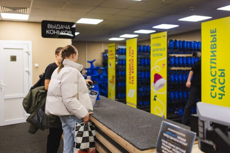 Рядом с катком установлена праздничная фотозона. Также в специальной зоне «Фабрика подарков» можно получить бесплатную фирменную открытку банка при упаковке своего подарка.