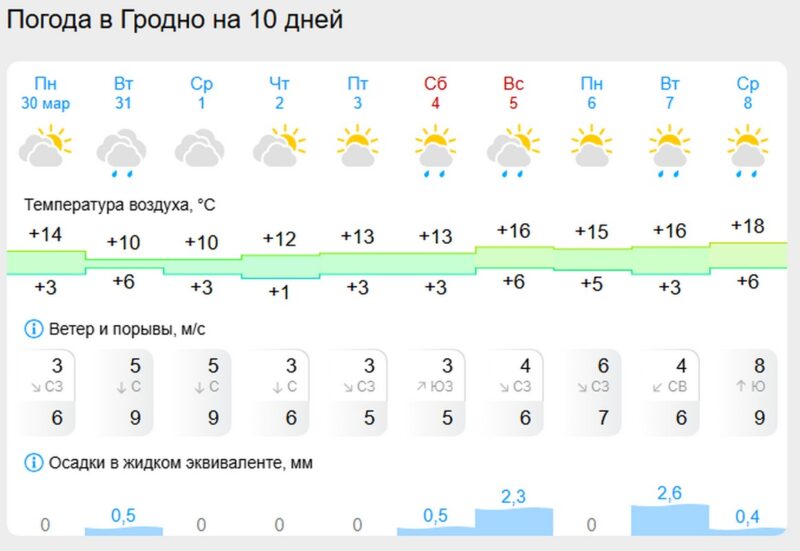 По области и стране в целом картина схожая: север и северо-восток Беларуси остаются немного прохладнее — там +8…+12 °С и больше облачности. Южные регионы, включая Гродненскую область, находятся под влиянием теплого потока. В соседних регионах уже фиксируются температуры около +20 °С. В ближайшие дни ожидается новая волна тепла после небольшого похолодания.