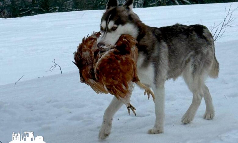 Впрочем, на деле это все же собака. Скорее всего, хаски. А вот в зубах у пса действительно курица. Причем домашняя птица совсем не маленькая. Явно домашняя.