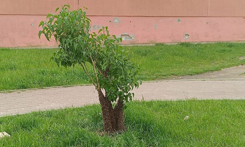 Шок-контент из Лиды – во дворе одной из многоэтажек рой пчел решил обустроить гнездо. Насекомые атаковали небольшой куст сирени – на нем собрались, наверное, десятки тысяч особей. Причем все это – рядом с детской площадкой и в нескольких метрах от окон жилых домов. Обеспокоенные жители вызвали спасателей.