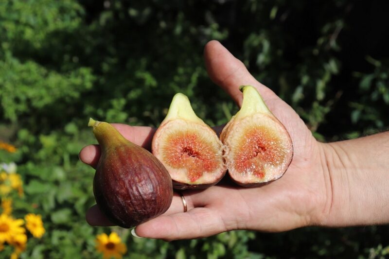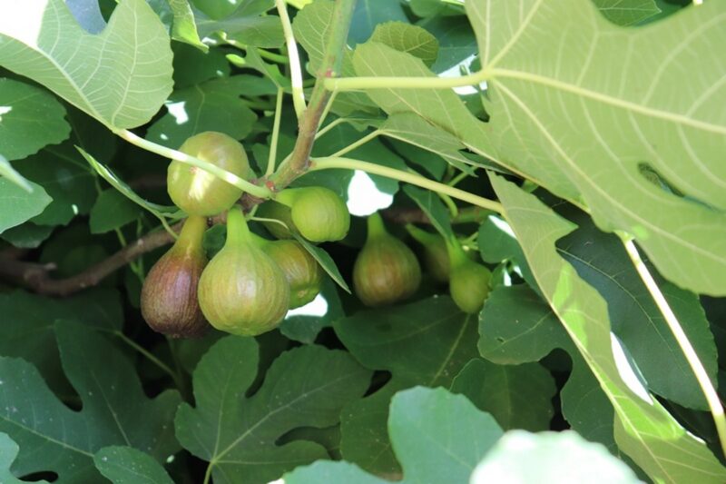 Затем, чуть присмотревшись, на конце каждой ветки можно увидеть небольшие зеленые плоды грушевидной формы. Они крепятся к самой ветке с помощью коротких черешков. У самой верхушки побега они мелкие, величиной с горошину, с вишню. А дальше, по направлению к основанию ветки, становятся всё крупнее. Если слегка раздвинуть ветки, можно увидеть наполовину и полностью созревшие плоды величиной примерно со среднюю грушу. Чем плод спелее, тем больше его зеленые бока покрывает румянец красно-коричневого цвета с легким лиловым оттенком. На сорте «брунсвик», между прочим, вызревают одни из самых крупных плодов инжира.