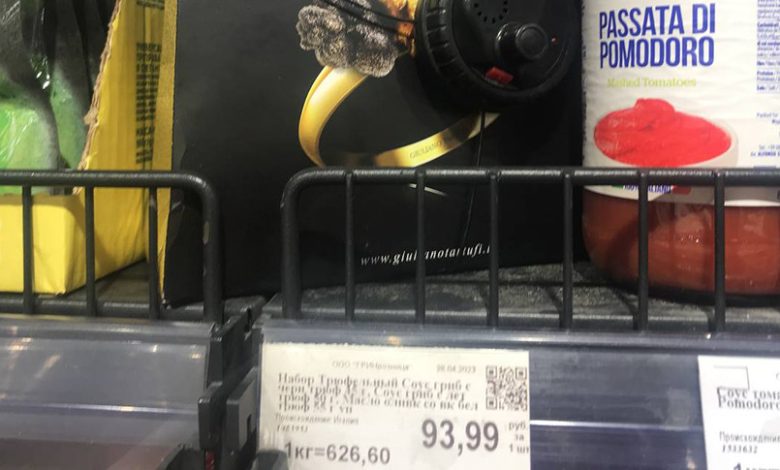 Внутрь картона цивилизованно посмотреть нельзя, на нем антикражная метка. Этикетка говорит, что там два соуса с трюфелем и оливковое масло с трюфелем, все сделано в Италии. Еще с обратной стороны упаковки пишут, что это «подарок для гурманов».