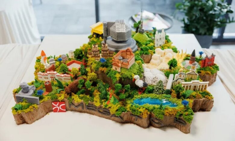 Кондитерское изделие, изготовленное группой компаний Megatop, имеет внушительные размеры — почти метр на метр и весит около 40 килограммов. Все элементы декора, представляющие достопримечательности регионов, выполнены вручную.