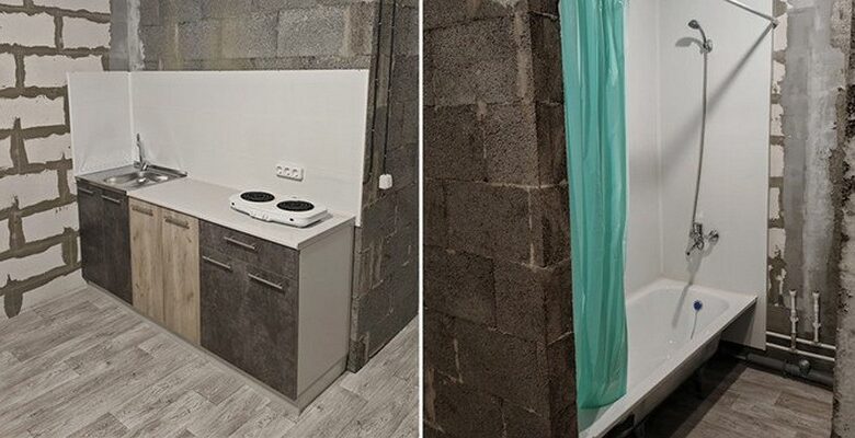 — Без ремонта, но для проживания есть все необходимое, — отмечает автор объявления. — Установлены унитаз, ванна, столешница с мойкой, на полу линолеум, стены прогрунтованы. Розетки все есть и выключатель. В санузле есть трубы и 220 В для подключения стиральной машинки.