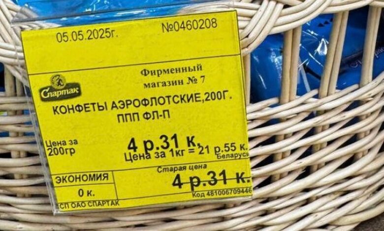 На фото — эффектный желтый ценник с надписью: «Экономия: 0 копеек». То есть конфеты «Аэрофлотские» весом 200 г продаются по цене 4 рубля 31 копейка — ровно за ту же сумму, что и раньше.