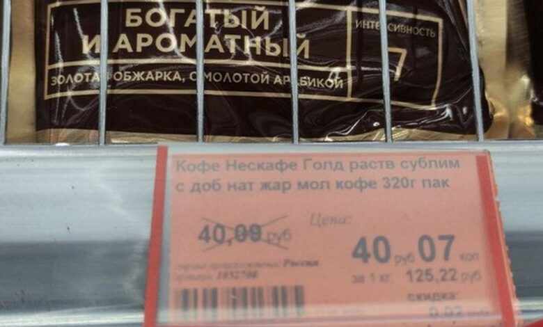 Читатель Андрей рассказал, что сделал это фото в одном из супермаркетов сети «Корона». На нем цена в 40,09 рубля за 320-граммовую пачку растворимого кофе Nescafe Gold перечеркнута, рядом написана новая — 40,07 рубля за пачку. Получается, скидка составляет всего 2 копейки.