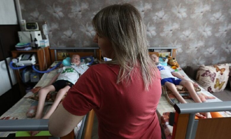На стене в комнате Вадика и Максима висит большой телевизор. Показывает он только мультики: так хотят 9-летние двойняшки. «Командует всем Вадик», — улыбается мама Олеся. Оба мальчика не говорят, не ходят, не двигают руками и ногами — даже дышат они только благодаря аппаратам ИВЛ. Если Вадиму мультик не нравится, может запищать один из аппаратов, к которым подключен ребенок.