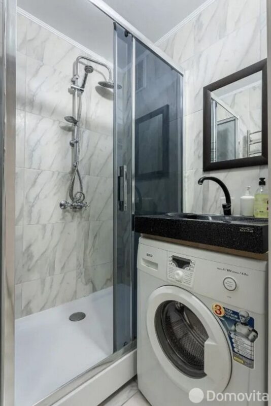 Кухня новая, укомплектованная техникой, и выглядит очень современно — всё под рукой и ничего лишнего. В ванной комнате реализованы отличные дизайнерские решения: инсталляция, душевой уголок, подвесной умывальник, зеркало с подсветкой и даже потолочный диффузор с выведенной клавишей включения — мелочи, которые делают жизнь комфортнее. Вместо газовой колонки установлен бойлер на 80 литров.