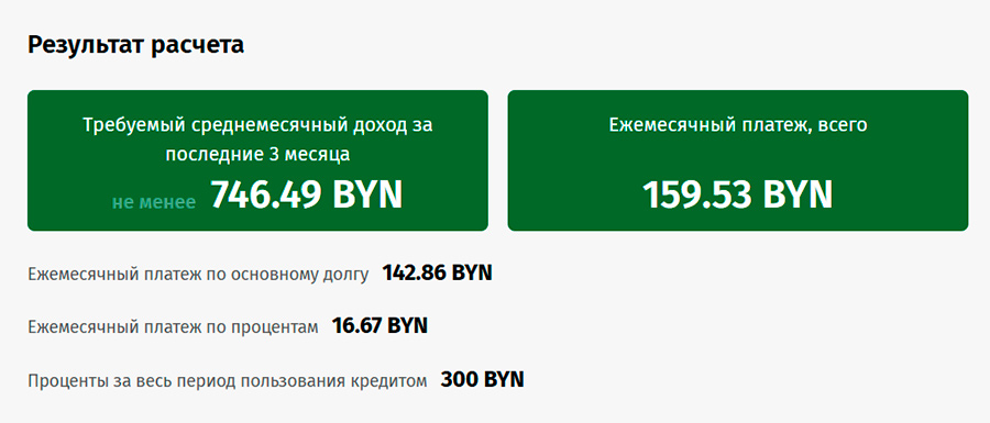 Так, если вам нужно одолжить на три года ровно Br5000 на одну или несколько покупок по программе «На родныя тавары», ваш среднемесячный доход за последние три месяца не должен быть меньше Br746,49.