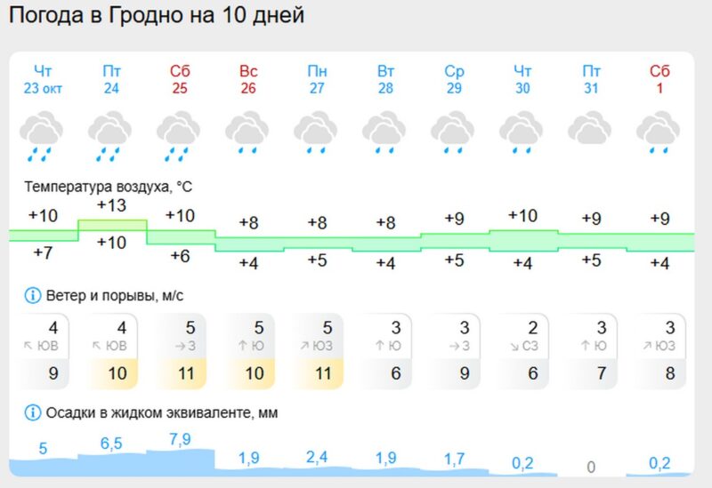 «Под эгидой атлантических циклонов в ближайшее время в Беларуси объявляется сезон осенних дождей. При этом до конца текущей недели еще сохранится положительная температурная аномалия, а на следующей неделе температурный фон вернется в климатическое русло. Так, в ближайшие сутки, 24 октября (пятница), под влиянием атмосферных фронтов и воздушных масс атлантического происхождения в Беларуси ожидается теплая с осадками погода. Ночные минимумы составят 6-12 градусов тепла, а днем воздух прогреется до 12-17 градусов. В предстоящие выходные и начале следующей рабочей недели (25-27 октября) территория нашей страны продолжит находиться в циклонической циркуляции, поэтому в стране сохранится неустойчивая с дождями различной интенсивности погода. 25 октября (суббота) местами дожди будут достигать сильных критериев. Вместе с тем 25-27 октября (суббота — понедельник) в отдельных районах страны осадки будут сопровождаться сильным порывистым ветром. При этом вслед за фронтальными разделами начнет поступать прохладная воздушная масса, температурный фон понизится, но по-прежнему будет находиться на 1-3 градуса выше средних многолетних значений (климатическая норма третьей декады октября 3,5-6,6 градуса)», — рассказали синоптики.