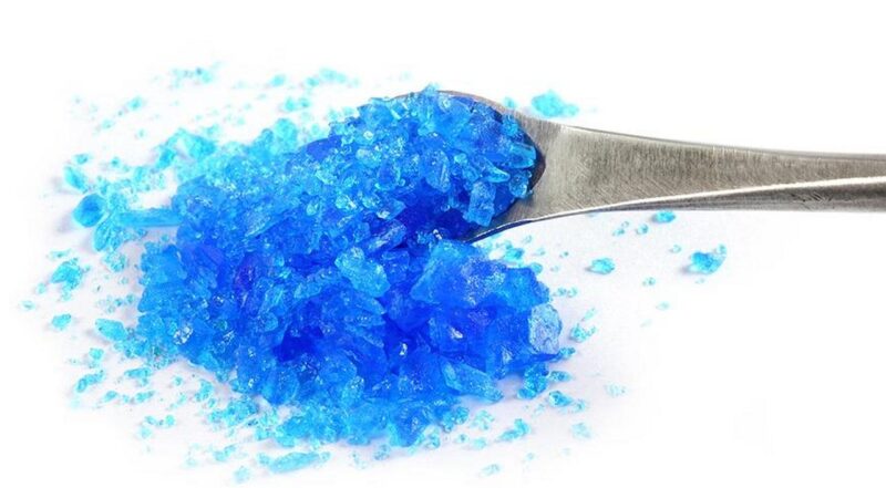 - Разводим медный купорос. Отмерьте 100 г купороса (лучше использовать весы). Засыпьте в одну емкость, залейте 1–2 литрами горячей воды (40–50 °C), перемешайте до полного растворения. Затем долейте холодную воду, чтобы получилось 5 литров.