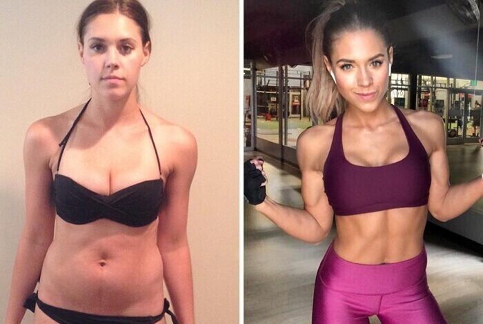 «Разница в весе на этих снимках — всего 1,4 кг. Я всегда весила около 63-64 кг, но теперь у меня больше мускулов, чем жира, и я покупаю штаны на 7 размеров меньше»