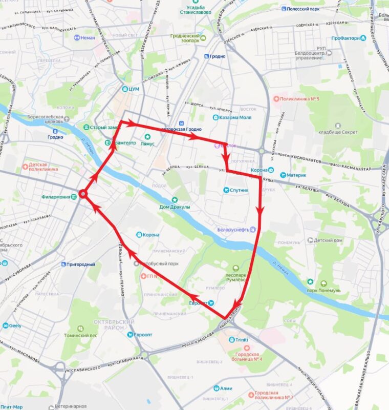 - пл. Советская – ул. Мостовая – ул. Стефана Батория – ул. Карла Маркса – пр. Космонавтов – ул. Лидская – ул. Белуша – пр. Румлевский – пр. Клецкова – пр. Янки Купалы – ул. Горновых – ул. Мостовая – пл. Советская.