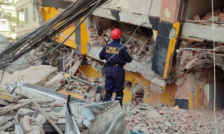 Поиски людей под завалами в пострадавшей от землетрясения Мьянме осложняется высокой температурой воздуха и повторными толчками. Об этом рассказал руководитель белорусского поисково-спасательного отряда Игорь Зарембо, сообщили БЕЛТА в МЧС.
