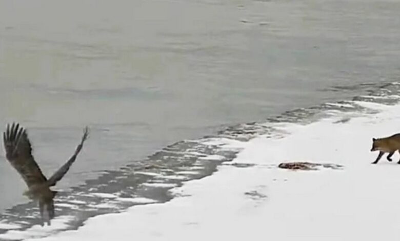 Первая хитрюга подобралась к белохвостому орлану, который спокойно трапезничал пойманной рыбой на литовском берегу. Лиса то приближалась, то отступала, а затем решилась на отчаянный бросок. Орлан, не желая связываться с наглой конкуренткой, просто улетел, бросив свой обед.